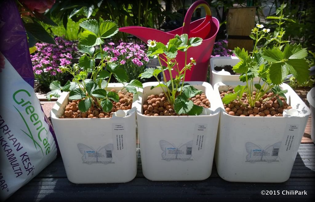 Tähän aikaan kesästä, kun kotimaisten mansikoiden hinta on huipussaan, saa puutarhaliikkeistä edullisesti mansikantaimia. Ilotalossa on tilaa, ja altakasteluruukkuja vapaana, joten ostin kolmen eri lajikkeen mansikantainta.